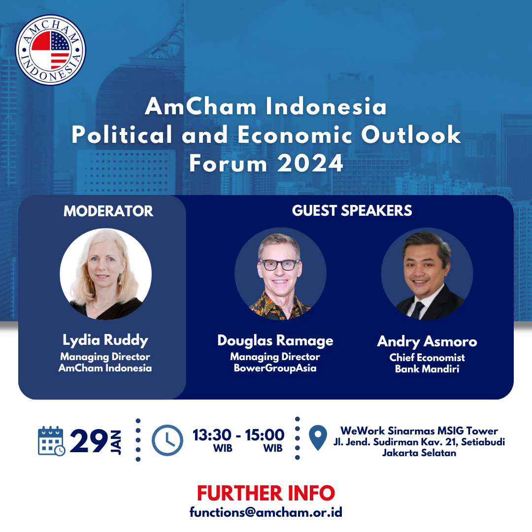 Cancellation must be in writing via e-mail to functions@amcham.or.id latest by noon on Friday, January 26, 2024. Please be advised that ‘no-shows’ may be billed at full price.
